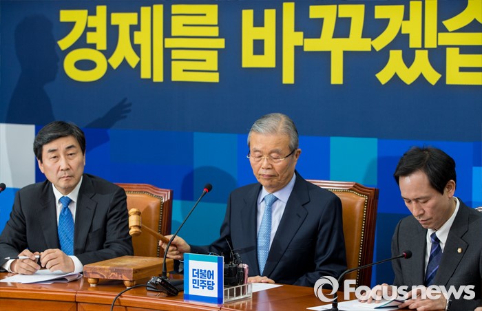 (서울=포커스뉴스) 16일 오전 서울 여의도 국회에서 열린 더불어민주당 제34차 비상대책위원회의에 참석한 김종인(가운데) 비대위원회 대표가 개회를 알리는 의사봉을 두드리고 있다.