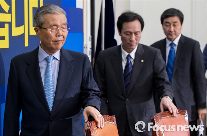 (서울=포커스뉴스) 16일 오전 서울 여의도 국회에서 열린 더불어민주당 제34차 비상대책위원회의에 김종인(맨 왼쪽부터) 비대위원회 대표, 우상호 원내대표, 이종걸 전 원내대표가 입장하고 있다.
