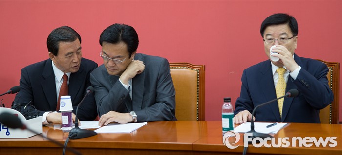(서울=포커스뉴스) 정진석(가운데) 새누리당 원내대표가 16일 오전 서울 여의도 국회에서 열린 비상대책위원회 상견례에서 홍문표(왼쪽) 사무총장 대행과 대화를 나누고 있다. 오른쪽은 김광림 정책위의장.