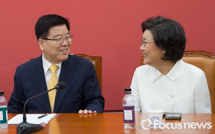 (서울=포커스뉴스) 김광림(왼쪽) 새누리당 정책위의장이 16일 오전 서울 여의도 국회에서 열린 비상대책위원회 상견례에서 이혜훈 비대위원과 대화를 나누고 있다.