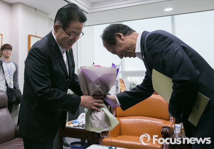 (서울=포커스뉴스) 박지원(왼쪽) 국민의당 원내대표가 16일 오전 서울 여의도 국회 의원회관을 방문한 최문순 강원도지사로부터 면담에 앞서 당선 축하 꽃다발을 받고 있다.