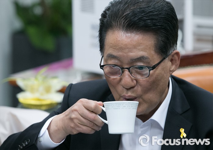 (서울=포커스뉴스) 박지원 국민의당 원내대표가 16일 오전 서울 여의도 국회 의원회관을 방문한 최문순 강원도지사와 현안 관련 면담 중 음료를 마시고 있다.