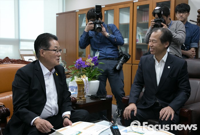 (서울=포커스뉴스) 박지원(왼쪽) 국민의당 원내대표가 16일 오전 서울 여의도 국회 의원회관을 방문한 최문순 강원도지사와 현안 관련 면담을 하고 있다.