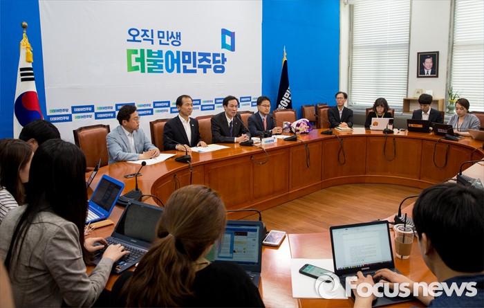 (서울=포커스뉴스) 16일 오전 서울 여의도 국회 더불어민주당 원내대표회의실에서 열린 최문순 강원도지사와의 면담에서 우상호 원내대표가 인사말을 하고 있다.