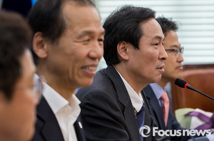 (서울=포커스뉴스) 16일 오전 서울 여의도 국회 더불어민주당 원내대표회의실에서 열린 최문순 강원도지사와의 면담에서 우상호 원내대표가 인사말을 하고 있다.