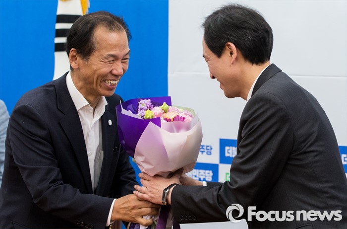 (서울=포커스뉴스) 16일 오전 서울 여의도 국회 더불어민주당 원내대표회의실을 방문한 최문순 강원도지사가 우상호 원내대표에게 당선 축하 꽃다발을 건네고 있다.