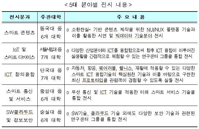 대학ICT연구센터 포럼은 대학ICT연구센터의 연구역량 우수성을 홍보하고 산업계와 협업을 강화하기 위해 연구성과물을 전시하고 산·학·연이 기술워크숍을 여는 것이다. 전시관은ICT 생활 밀착형 주제를 5대 분야(스마트 콘텐츠, 사물인터넷 및 스마트 디바이스, ICT 창의융합, 스마트통신 및 서비스, 소프트웨어 클라우드 및 정보보안)로 그룹화해 테마 중심으로 구성했다.