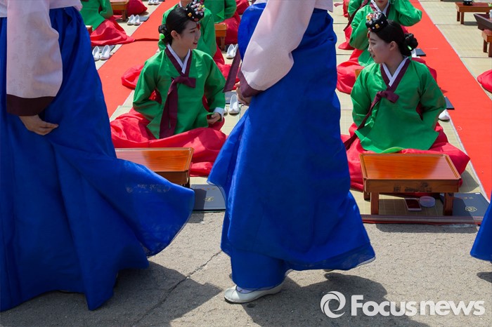 (서울=포커스뉴스) 16일 오전 서울 중구 남산골 한옥마을 천우각 광장에서 열린 제44회 성년의 날 행사에 참석한 학생들이 전통 성년례를 올리고 있다.
