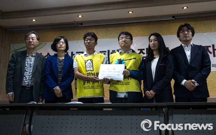 (서울=포커스뉴스) 16일 오전 서울 서초구 민변 대회의실에서 열린 가습기살균제피해자 공동소송대리인단의 집단소송 소장 접수 기자회견에서 피해자 대표들과 공동소송대리인단이 소장을 들고 있다.