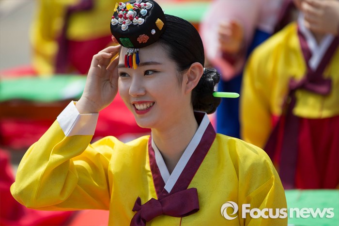 (서울=포커스뉴스) 16일 오전 서울 중구 남산골 한옥마을 천우각 광장에서 열린 제44회 성년의 날 행사에 참석한 학생들이 전통 성년례를 올리고 있다.