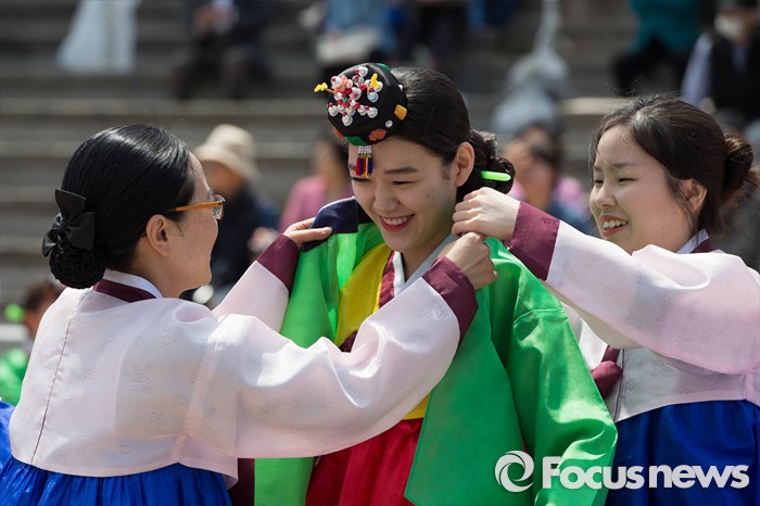 (서울=포커스뉴스) 16일 오전 서울 중구 남산골 한옥마을 천우각 광장에서 열린 제44회 성년의 날 행사에 참석한 학생들이 전통 성년례를 올리고 있다.