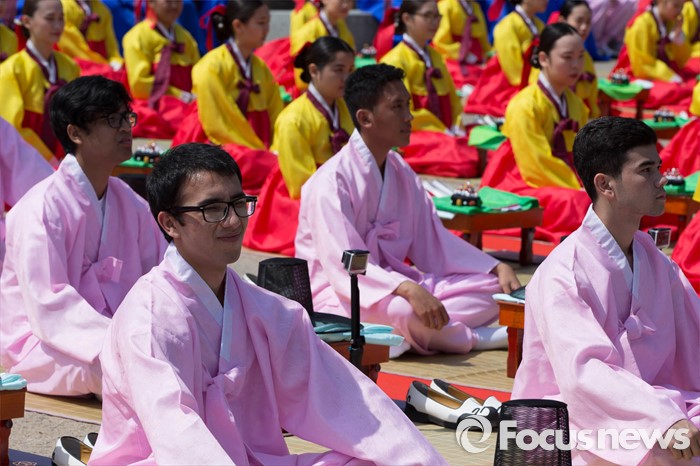 (서울=포커스뉴스) 16일 오전 서울 중구 남산골 한옥마을 천우각 광장에서 열린 제44회 성년의 날 행사에 참석한 학생들이 전통 성년례를 올리고 있다.