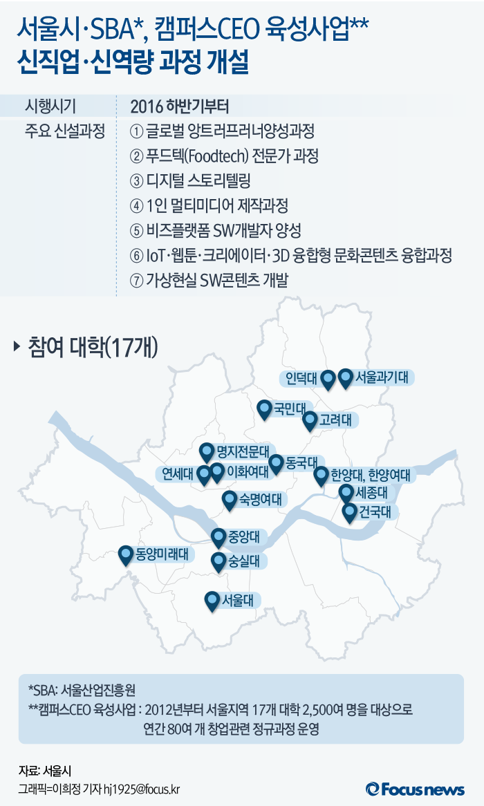 (서울=포커스뉴스) 서울시와 서울산업진흥원(SBA)는 '캠퍼스CEO 육성사업'에 참여하는 시내 17개 대학과 협력해 하반기부터 신직업·신역량 교육과정을 개설한다고 16일 밝혔다.