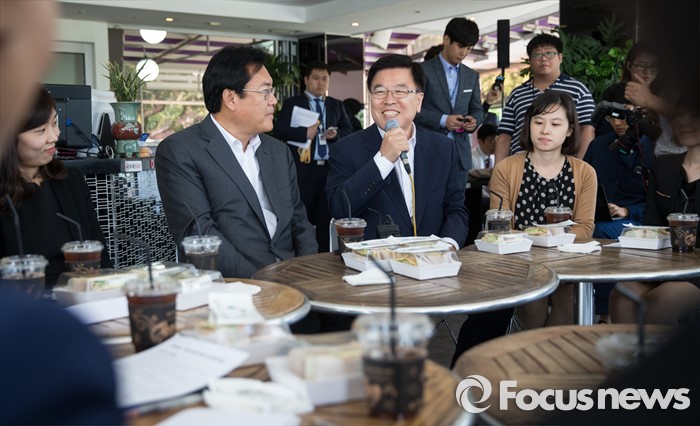 (서울=포커스뉴스) 정진석(오른쪽 세번째) 새누리당 원내대표와 김광림(오른쪽 두번째) 정책위의장이 16일 오후 서울 여의도 한강공원의 한 카페에서 '3040여성당직자 브라운백 미팅'을 갖고 있다.