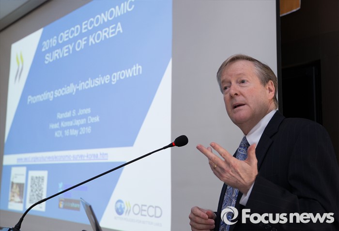 (세종=포커스뉴스) 랜달존스(Randal Jones) OECD 사무국 선임이코노미스트가 16일 오전 세종시 KDI(한국개발연구원) 영상회의실에서 열린 OECD 한국 경제보고서 발표 세미나에서 거시경제 동향 및 전망에 대한 기조발표를 하고 있다.