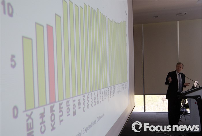 (세종=포커스뉴스) 랜달존스(Randal Jones) OECD 사무국 선임이코노미스트가 16일 오전 세종시 KDI(한국개발연구원) 영상회의실에서 열린 OECD 한국 경제보고서 발표 세미나에서 거시경제 동향 및 전망에 대한 기조발표를 하고 있다.