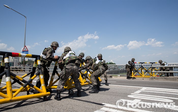 (서울=포커스뉴스) 제401차 민방위의 날인 16일 오후 서울 용산구 반포대교에서 군·경 관계자들이 합동 전시 교통통제소 설치 민방공대피훈련을 하고 있다.