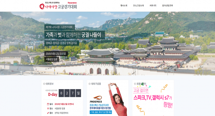 프로스펙스와 함께하는 제7회 나라사랑 고궁걷기대회는 포커스뉴스가 주최하고 황실문화원이 공동주관하며 국가보훈처, 서울특별시, 서울메트로, 서울도시철도공사의 후원으로 진행된다.프로스펙스와 함께하는 '제7회 나라사랑 고궁걷기대회 홈페이지 화면. <사진출처=고궁걷기대회 홈페이지>