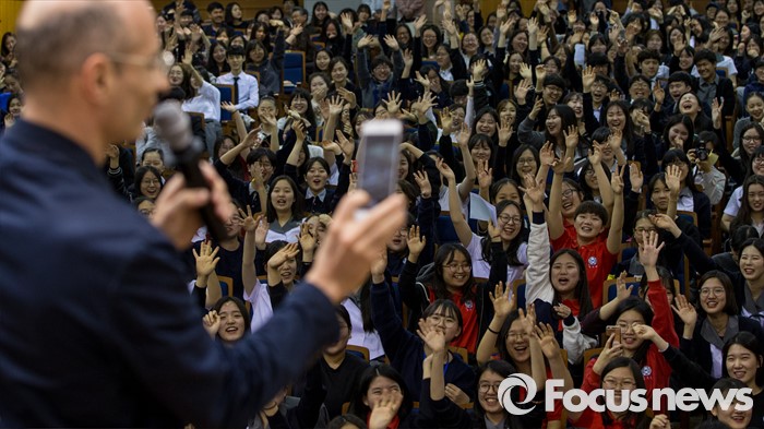 (서울=포커스뉴스) 16일 오후 서울 종로구 서울예술고등학교를 찾은 프랑스 작가 베르나르 베르베르가 '오늘날의 예술적 지능'이란 주제로 강연 도중 학생들을 촬영하고 있다.