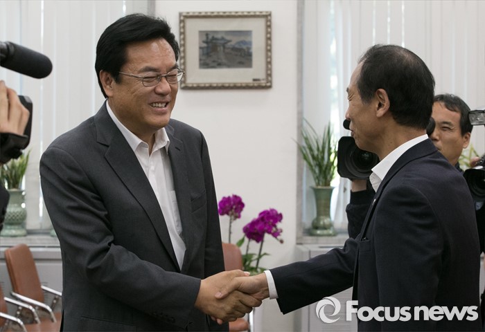 (서울=포커스뉴스) 정진석(왼쪽) 새누리당 원내대표가 16일 오후 서울 여의도 국회를 방문한 최문순 강원도지사와 만나 인사하고 있다.