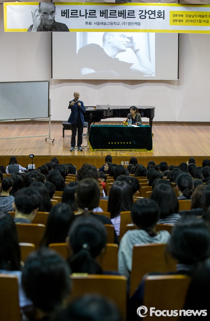 (서울=포커스뉴스) 16일 오후 서울 종로구 서울예술고등학교를 찾은 프랑스 작가 베르나르 베르베르가 '오늘날의 예술적 지능'이란 주제로 학생들에게 강연하고 있다.