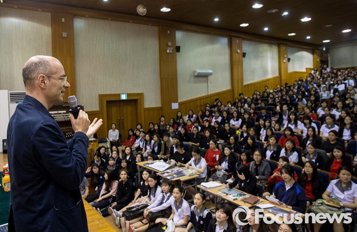 (서울=포커스뉴스) 16일 오후 서울 종로구 서울예술고등학교를 찾은 프랑스 작가 베르나르 베르베르가 '오늘날의 예술적 지능'이란 주제로 학생들에게 강연하고 있다.