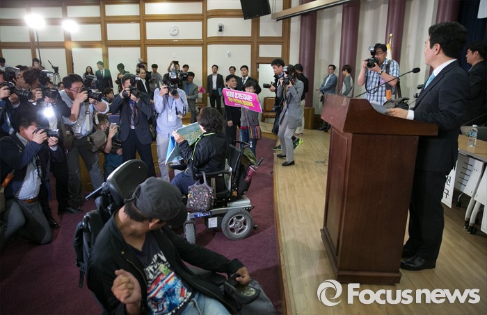 (서울=포커스뉴스) 16일 오후 서울 여의도 국회 의원회관에서 열린 '20대 국회, 협치 가능한가' 토론회에 참석한 남경필 경기도지사의 인사말 도중 장애인 이동권 보장을 요구하는 경기420장애인차별철폐공동투쟁단 등이 남 지사와 면담을 요구하며 손피켓을 들고 있다.