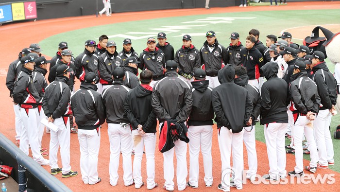 ※인터넷(포털사이트 네이버·다음)과 모바일(KBO공식앱) 시청 가능.(수원=포커스뉴스) 8일 수원 kt위즈파크에서 열린 2016 KBO리그 시범경기 두산-kt 경기에서 kt 조범현 감독이 경기를 마친후 선수들에게 플레이에 대해 평가를 하고 있다. 2016.03.08 우정식 기자