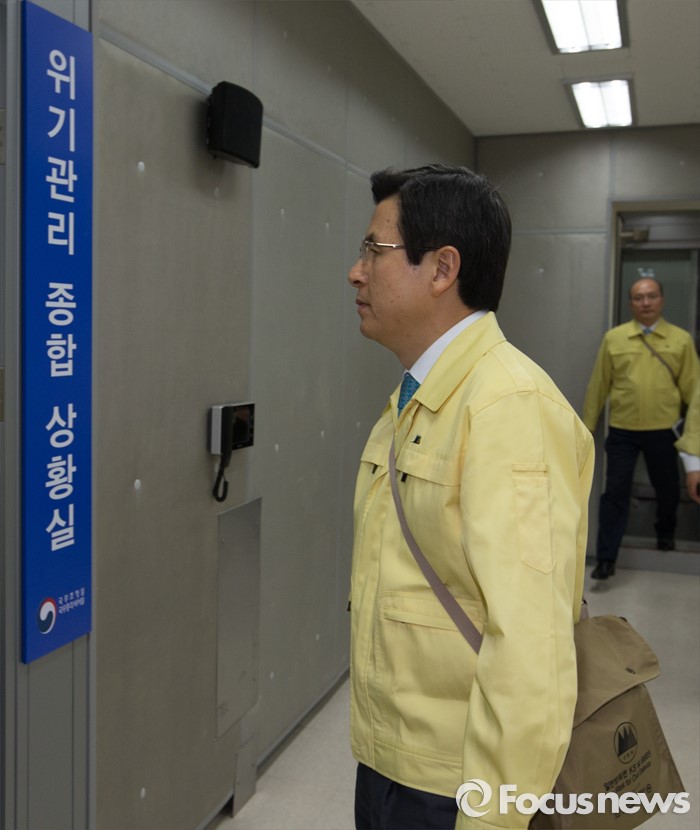 (세종=포커스뉴스) 황교안 국무총리가 16일 오후 세종시 정부세종청사 위기관리종합상황실에서 민방위의 날을 맞아 실시된 제401차 민방공 대피훈련에 참가하고 있다.