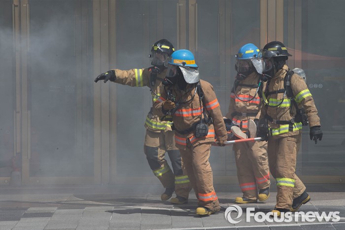 (서울=포커스뉴스) 16일 오후 서울 송파구 제2롯데월드몰에서 구조대원들이 '재난대응 안전한국훈련'에 참가해 인명구조 훈련을 하고 있다.