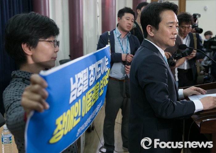 (서울=포커스뉴스) 16일 오후 서울 여의도 국회 의원회관에서 열린 '20대 국회, 협치 가능한가' 토론회에 참석한 남경필 경기도지사의 인사말 도중 장애인 이동권 보장을 요구하는 경기420장애인차별철폐공동투쟁단 등이 남 지사와 면담을 요구하며 손피켓을 들고 있다.
