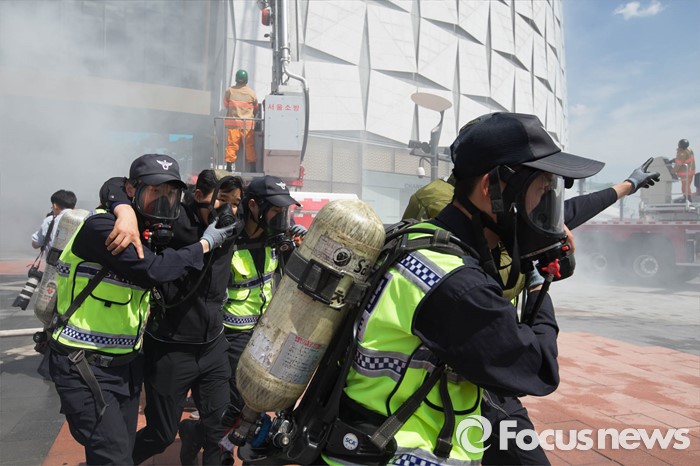 (서울=포커스뉴스) 16일 오후 서울 송파구 제2롯데월드몰에서 경찰들이 '재난대응 안전한국훈련'에 참가해 인명구조 및 대피 훈련을 하고 있다.