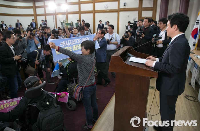 (서울=포커스뉴스) 16일 오후 서울 여의도 국회 의원회관에서 열린 '20대 국회, 협치 가능한가' 토론회에 참석한 남경필 경기도지사의 인사말 도중 장애인 이동권 보장을 요구하는 경기420장애인차별철폐공동투쟁단 등이 남 지사와 면담을 요구하며 손피켓을 들고 있다.
