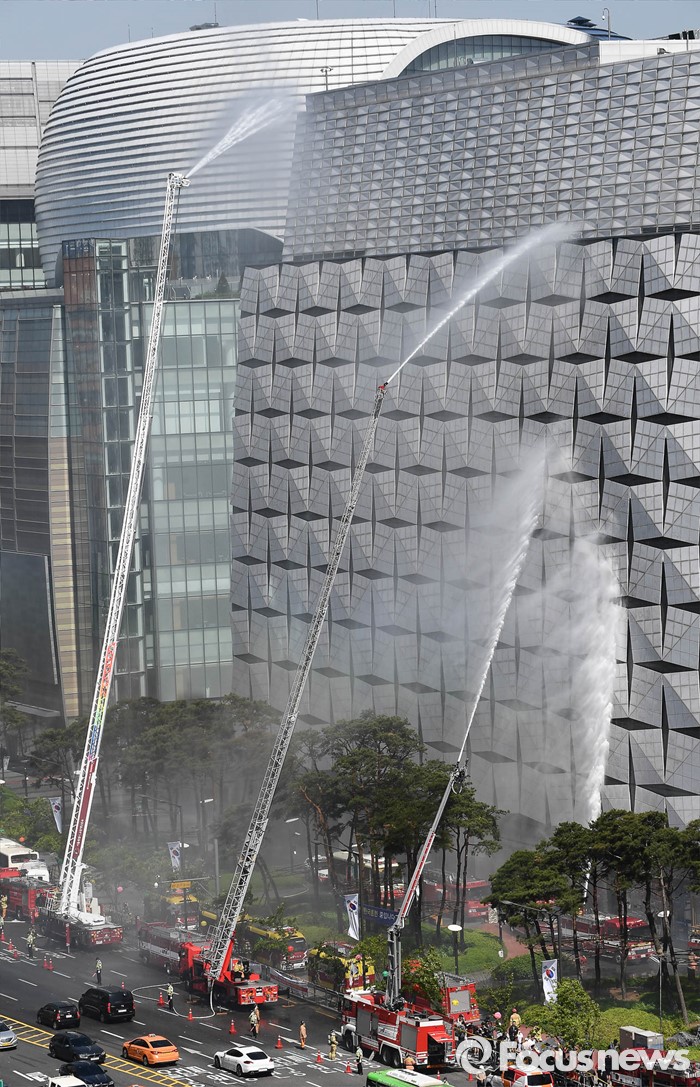 (서울=포커스뉴스) 16일 오후 서울 송파구 제2롯데월드몰에서 소방당국이 '재난대응 안전한국훈련'에 참가해 화재진압 훈련을 하고 있다.