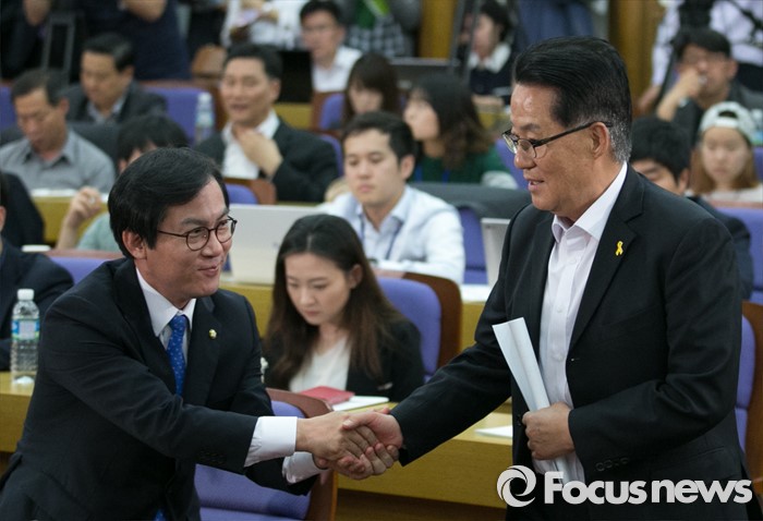 (서울=포커스뉴스) 16일 오후 서울 여의도 국회 의원회관에서 열린 '20대 국회, 협치 가능한가' 토론회에 참석한 박지원(오른쪽) 국민의다 원내대표와 김영우 새누리당 비대위원이 악수하고 있다.