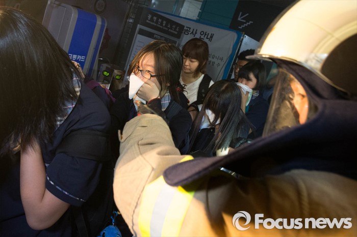 (서울=포커스뉴스) 16일 오후 서울 송파구 잠실역에서 시민들이 '재난대응 안전한국훈련'에 참가해 대피훈련을 하고 있다.