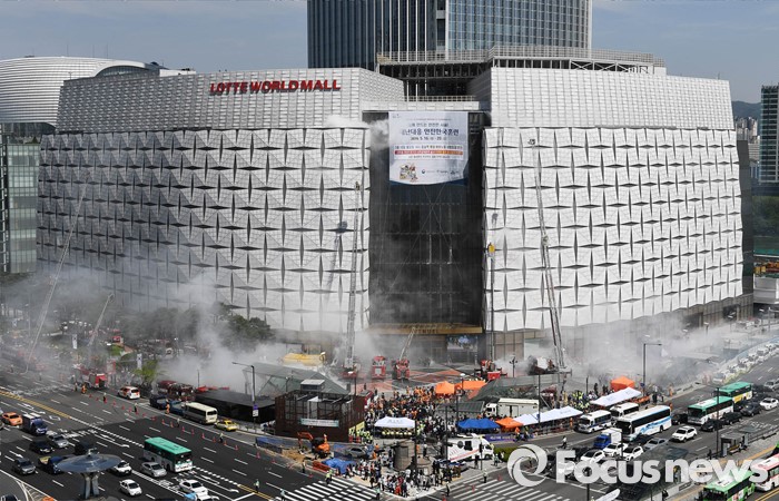 #2. 롯데 에비뉴엘동은 연기로 휩싸였다. 점원들은 신속히 소비자들이 대피할 수 있도록 안내했다. 사이렌 소리가 잠실을 뒤덮었다. 소방차가 건물을 둘러쌌다. 이내 물줄기를 내뿜으며 화재를 진압했다.