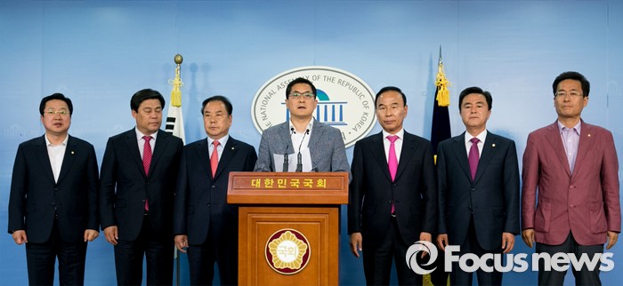 (서울=포커스뉴스) 16일 오후 서울 여의도 국회 정론관에서 새누리당 초·재선 의원 및 당선인들이 당 혁신위와 비대위원 재검토를 요구하는 성명서 발표 기자회견을 하고 있다. 왼쪽부터 이장우 의원, 김선동 당선인, 이우현, 박대출, 박덕흠, 김태흠, 함진규 의원.