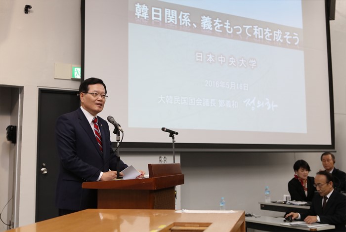 (서울=포커스뉴스) 일본을 공식 방문중인 정의화 국회의장이 16일 오전 일본 중앙대에서 '한일관계, 의(義)로써 화(和)를 이루자'란 주제로 강연을 하고 있다. <사진제공=국회>