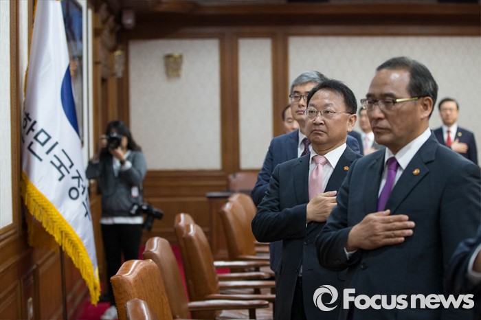 (서울=포커스뉴스) 17일 서울 종로구 정부서울청사에서 열린 국무회의에 참석한 유일호(오른쪽 두번째)경제부총리 등 국무위원들이 국민의례를 하고 있다.
