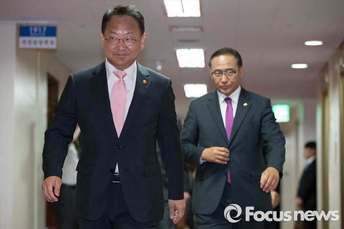 (서울=포커스뉴스) 17일 서울 종로구 정부서울청사에서 열린 국무회의에 유일호(왼쪽) 경제부총리 겸 기획재정부 장관이 회의장에 들어서고 있다.