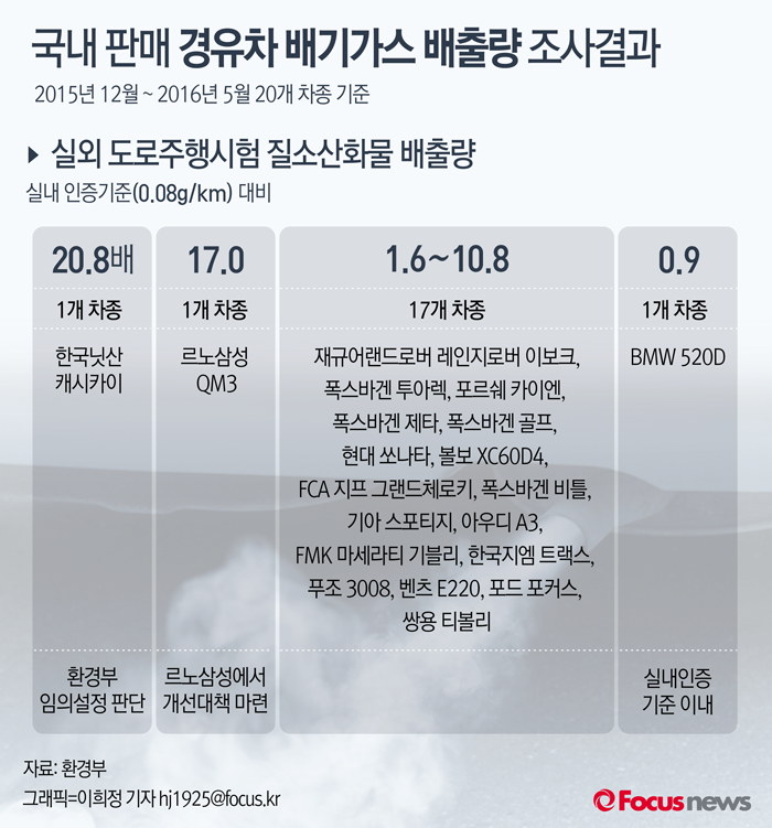 (서울=포커스뉴스) 16일 발표한 환경부 자료에 따르면 실외 도로주행시험에서 질소산화물 배출량은 캐시카이 차량이 실내인증기준(0.08g/km)의 20.8배, 르노삼성(주) QM3 차량이 17.0배로 높게 나타났다. 그 외 17개 차종은 실내 인증기준의 1.6~10.8배로 나타났으며, BMW 520d 1종만 실내 인증기준 이내인 0.9배로 나타났다.
