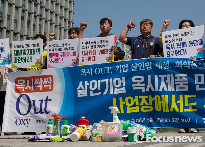 (서울=포커스뉴스) 17일 오전 서울 광화문광장에서 열린 '옥시 불매, 사업장 옥시 OUT' 선언 기자회견에 참석한 민주노총 조합원 및 가습기 살균제 피해자 가족들이 옥시를 규탄하는 구호를 외치고 있다.