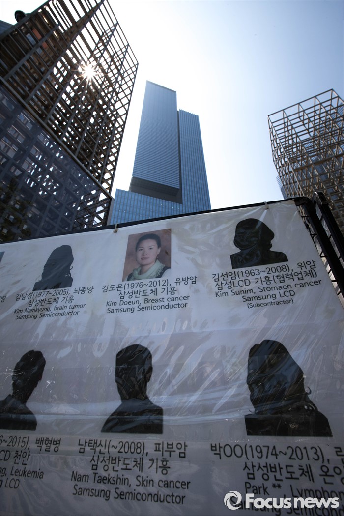 (서울=포커스뉴스) 17일 오전 서울 서초구 서초동 삼성전자 서초사옥 앞 반올림 농성장에서 열린삼성직업병 문제 올바른 해결을 촉구하는 반올림 기자회견장 옆에 삼성반도체 사업장에서 근무하다 사망한 직원들의 사진이 놓여져 있다.