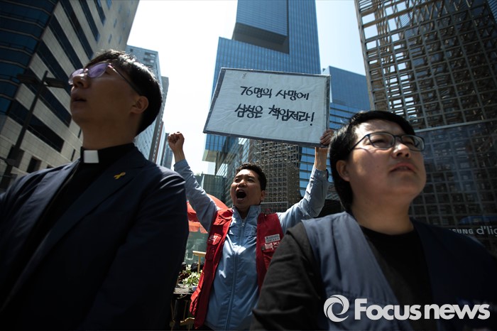 (서울=포커스뉴스) 17일 오전 서울 서초구 서초동 삼성전자 서초사옥 앞 반올림 농성장에서 반올림 관계자들이 삼성직업병 문제 올바른 해결을 촉구하는 반올림 기자회견을 하고 있다.
