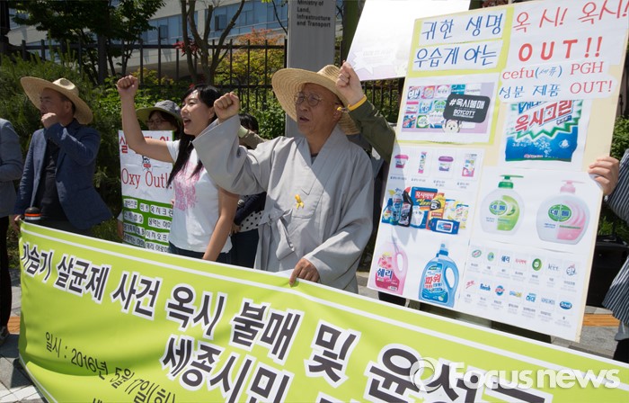 (세종=포커스뉴스) 세종생태도시시민협의회와 세종시민연대회의 구성원들이 17일 오전 세종시 정부세종청사 환경부 앞에서 가습기 살균제 사건 옥시 불매 및 윤성규 환경부 장관 사퇴촉구 기자회견을 하고 있다.