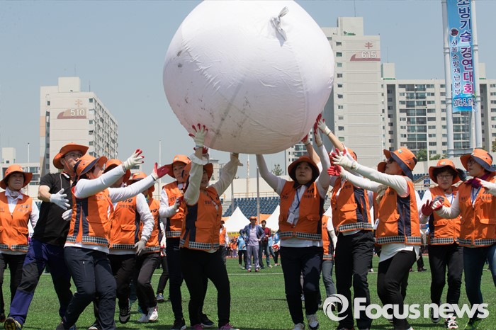 (서울=포커스뉴스) 17일 오전 서울 양천구 목동운동장에서 열린 2016 의용소방대 종합소방기술경연대회에서 참가자들이 공 굴리기 경기를 하고 있다.
