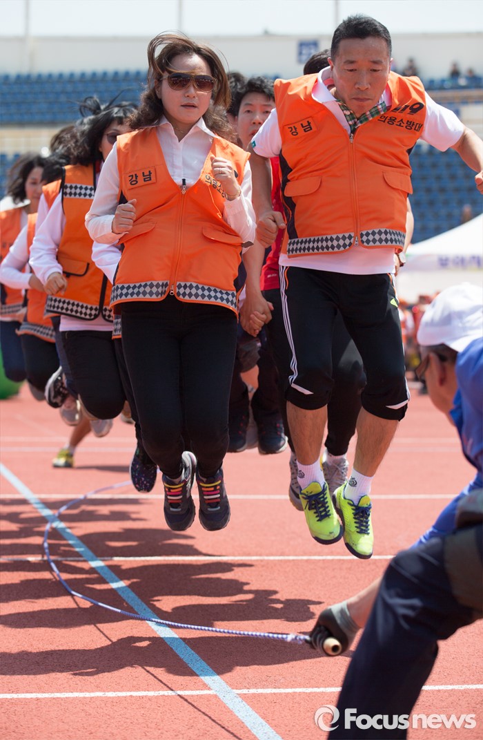 (서울=포커스뉴스) 17일 오전 서울 양천구 목동운동장에서 열린 2016 의용소방대 종합소방기술경연대회에서 참가자들이 단체줄넘기 경기를 하고 있다.