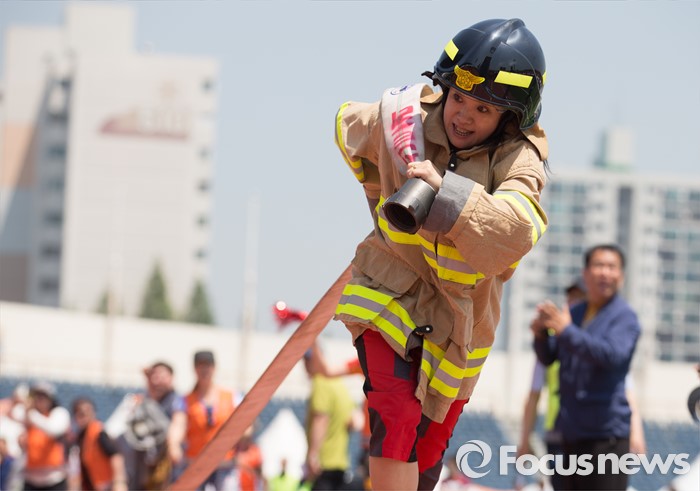 (서울=포커스뉴스) 17일 오전 서울 양천구 목동운동장에서 열린 2016 의용소방대 종합소방기술경연대회에서 참가자들이 소방호스 끌기 경기를 하고 있다.