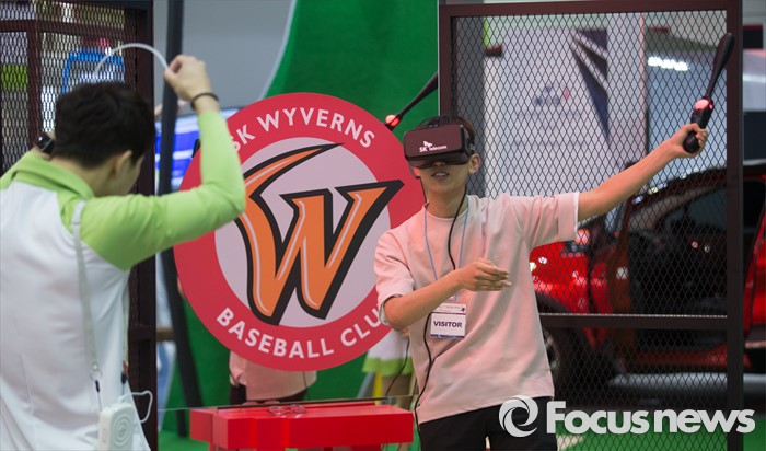 (서울=포커스뉴스) 17일 오전 서울 강남구 코엑스에서 열린 '월드 IT쇼 2016' 에 참여한 한 관람객이 가상현실을 기반으로한 야구 체험을 하고 있다.